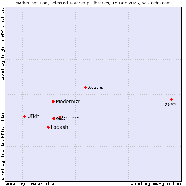 TechnologiesContent ManagementServer-side Languages Client-side Languages JavaScript Libraries CSS Frameworks Web Servers Web Panels Operating Systems Web Hosting Data Centers Reverse Proxies DNS Servers Email Servers SSL Certificate Authorities Content Delivery Traffic Analysis Tools Advertising Networks Tag Managers Social Widgets Site Elements Structured Data Markup Languages Character Encodings Image File Formats Top Level Domains Server Locations Content Languages | Technologies > JavaScript Libraries > Technology usage comparison Comparison of the usage statistics of Modernizr vs. Lodash vs. UIkit for websitesThis report shows the usage statistics of Modernizr vs. Lodash vs. UIkit as JavaScript library on the web. See technologies overview for explanations on the methodologies used in the surveys. Our reports are updated daily. Usage and market shareThis diagram shows the percentages of websites using the selected technologies. How to read the diagram: