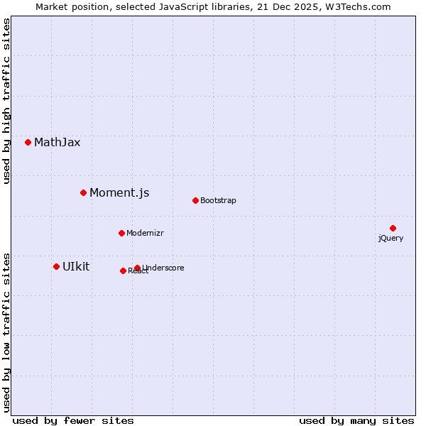 TechnologiesContent ManagementServer-side Languages Client-side Languages JavaScript Libraries CSS Frameworks Web Servers Web Panels Operating Systems Web Hosting Data Centers Reverse Proxies DNS Servers Email Servers SSL Certificate Authorities Content Delivery Traffic Analysis Tools Advertising Networks Tag Managers Social Widgets Site Elements Structured Data Markup Languages Character Encodings Image File Formats Top Level Domains Server Locations Content Languages | Technologies > JavaScript Libraries > Technology usage comparison Comparison of the usage statistics of Moment.js vs. UIkit vs. MathJax for websitesThis report shows the usage statistics of Moment.js vs. UIkit vs. MathJax as JavaScript library on the web. See technologies overview for explanations on the methodologies used in the surveys. Our reports are updated daily. Usage and market shareThis diagram shows the percentages of websites using the selected technologies. How to read the diagram: