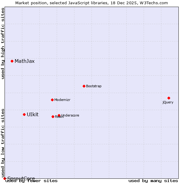 TechnologiesContent ManagementServer-side Languages Client-side Languages JavaScript Libraries CSS Frameworks Web Servers Web Panels Operating Systems Web Hosting Data Centers Reverse Proxies DNS Servers Email Servers SSL Certificate Authorities Content Delivery Traffic Analysis Tools Advertising Networks Tag Managers Social Widgets Site Elements Structured Data Markup Languages Character Encodings Image File Formats Top Level Domains Server Locations Content Languages | Technologies > JavaScript Libraries > Technology usage comparison Comparison of the usage statistics of UIkit vs. MathJax vs. SproutCore for websitesThis report shows the usage statistics of UIkit vs. MathJax vs. SproutCore as JavaScript library on the web. See technologies overview for explanations on the methodologies used in the surveys. Our reports are updated daily. Usage and market shareThis diagram shows the percentages of websites using the selected technologies. How to read the diagram: