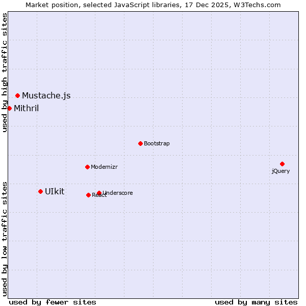 TechnologiesContent ManagementServer-side Languages Client-side Languages JavaScript Libraries CSS Frameworks Web Servers Web Panels Operating Systems Web Hosting Data Centers Reverse Proxies DNS Servers Email Servers SSL Certificate Authorities Content Delivery Traffic Analysis Tools Advertising Networks Tag Managers Social Widgets Site Elements Structured Data Markup Languages Character Encodings Image File Formats Top Level Domains Server Locations Content Languages | Technologies > JavaScript Libraries > Technology usage comparison Comparison of the usage statistics of UIkit vs. Mustache.js vs. Mithril for websitesThis report shows the usage statistics of UIkit vs. Mustache.js vs. Mithril as JavaScript library on the web. See technologies overview for explanations on the methodologies used in the surveys. Our reports are updated daily. Usage and market shareThis diagram shows the percentages of websites using the selected technologies. How to read the diagram: