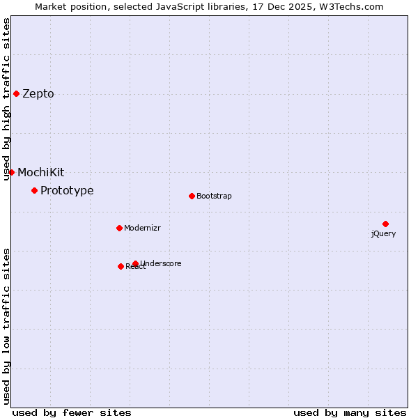 TechnologiesContent ManagementServer-side Languages Client-side Languages JavaScript Libraries CSS Frameworks Web Servers Web Panels Operating Systems Web Hosting Data Centers Reverse Proxies DNS Servers Email Servers SSL Certificate Authorities Content Delivery Traffic Analysis Tools Advertising Networks Tag Managers Social Widgets Site Elements Structured Data Markup Languages Character Encodings Image File Formats Top Level Domains Server Locations Content Languages | Technologies > JavaScript Libraries > Technology usage comparison Comparison of the usage statistics of Prototype vs. Zepto vs. MochiKit for websitesThis report shows the usage statistics of Prototype vs. Zepto vs. MochiKit as JavaScript library on the web. See technologies overview for explanations on the methodologies used in the surveys. Our reports are updated daily. Usage and market shareThis diagram shows the percentages of websites using the selected technologies. How to read the diagram: