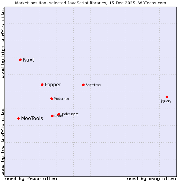 TechnologiesContent ManagementServer-side Languages Client-side Languages JavaScript Libraries CSS Frameworks Web Servers Web Panels Operating Systems Web Hosting Data Centers Reverse Proxies DNS Servers Email Servers SSL Certificate Authorities Content Delivery Traffic Analysis Tools Advertising Networks Tag Managers Social Widgets Site Elements Structured Data Markup Languages Character Encodings Image File Formats Top Level Domains Server Locations Content Languages | Technologies > JavaScript Libraries > Technology usage comparison Comparison of the usage statistics of Popper vs. Nuxt vs. MooTools for websitesThis report shows the usage statistics of Popper vs. Nuxt vs. MooTools as JavaScript library on the web. See technologies overview for explanations on the methodologies used in the surveys. Our reports are updated daily. Usage and market shareThis diagram shows the percentages of websites using the selected technologies. How to read the diagram: