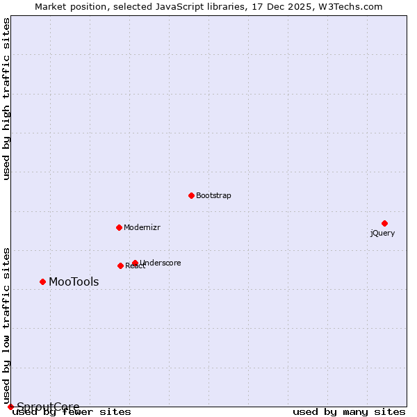TechnologiesContent ManagementServer-side Languages Client-side Languages JavaScript Libraries CSS Frameworks Web Servers Web Panels Operating Systems Web Hosting Data Centers Reverse Proxies DNS Servers Email Servers SSL Certificate Authorities Content Delivery Traffic Analysis Tools Advertising Networks Tag Managers Social Widgets Site Elements Structured Data Markup Languages Character Encodings Image File Formats Top Level Domains Server Locations Content Languages ComparisonCompare with other | Technologies > JavaScript Libraries > Technology usage comparison Comparison of the usage statistics of MooTools vs. SproutCore for websitesThis report shows the usage statistics of MooTools vs. SproutCore as JavaScript library on the web. See technologies overview for explanations on the methodologies used in the surveys. Our reports are updated daily. Usage and market shareThis diagram shows the percentages of websites using the selected technologies. How to read the diagram: