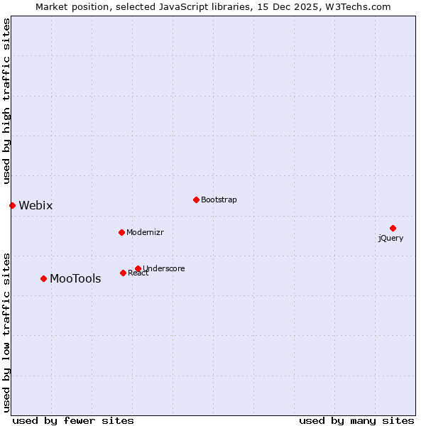 TechnologiesContent ManagementServer-side Languages Client-side Languages JavaScript Libraries CSS Frameworks Web Servers Web Panels Operating Systems Web Hosting Data Centers Reverse Proxies DNS Servers Email Servers SSL Certificate Authorities Content Delivery Traffic Analysis Tools Advertising Networks Tag Managers Social Widgets Site Elements Structured Data Markup Languages Character Encodings Image File Formats Top Level Domains Server Locations Content Languages ComparisonCompare with other | Technologies > JavaScript Libraries > Technology usage comparison Comparison of the usage statistics of MooTools vs. Webix for websitesThis report shows the usage statistics of MooTools vs. Webix as JavaScript library on the web. See technologies overview for explanations on the methodologies used in the surveys. Our reports are updated daily. Usage and market shareThis diagram shows the percentages of websites using the selected technologies. How to read the diagram: