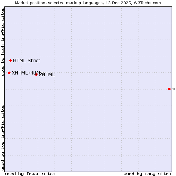 TechnologiesContent ManagementServer-side Languages Client-side Languages JavaScript Libraries CSS Frameworks Web Servers Web Panels Operating Systems Web Hosting Data Centers Reverse Proxies DNS Servers Email Servers SSL Certificate Authorities Content Delivery Traffic Analysis Tools Advertising Networks Tag Managers Social Widgets Site Elements Structured Data Markup Languages Character Encodings Image File Formats Top Level Domains Server Locations Content Languages | Technologies > Markup Languages > Technology usage comparison Comparison of the usage statistics of XHTML vs. HTML Strict vs. XHTML+RDFa for websitesThis report shows the usage statistics of XHTML vs. HTML Strict vs. XHTML+RDFa as markup language on the web. See technologies overview for explanations on the methodologies used in the surveys. Our reports are updated daily. UsageThis diagram shows the percentages of websites using the selected technologies. How to read the diagram: