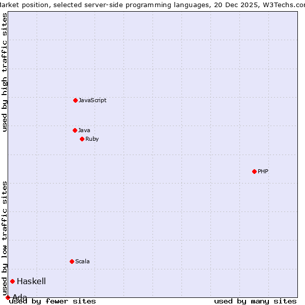 TechnologiesContent ManagementServer-side Languages Client-side Languages JavaScript Libraries CSS Frameworks Web Servers Web Panels Operating Systems Web Hosting Data Centers Reverse Proxies DNS Servers Email Servers SSL Certificate Authorities Content Delivery Traffic Analysis Tools Advertising Networks Tag Managers Social Widgets Site Elements Structured Data Markup Languages Character Encodings Image File Formats Top Level Domains Server Locations Content Languages ComparisonCompare with other | Technologies > Server-side Languages > Technology usage comparison Comparison of the usage statistics of Haskell vs. Ada for websitesThis report shows the usage statistics of Haskell vs. Ada as server-side programming language on the web. See technologies overview for explanations on the methodologies used in the surveys. Our reports are updated daily. UsageThis diagram shows the percentages of websites using the selected technologies. How to read the diagram: