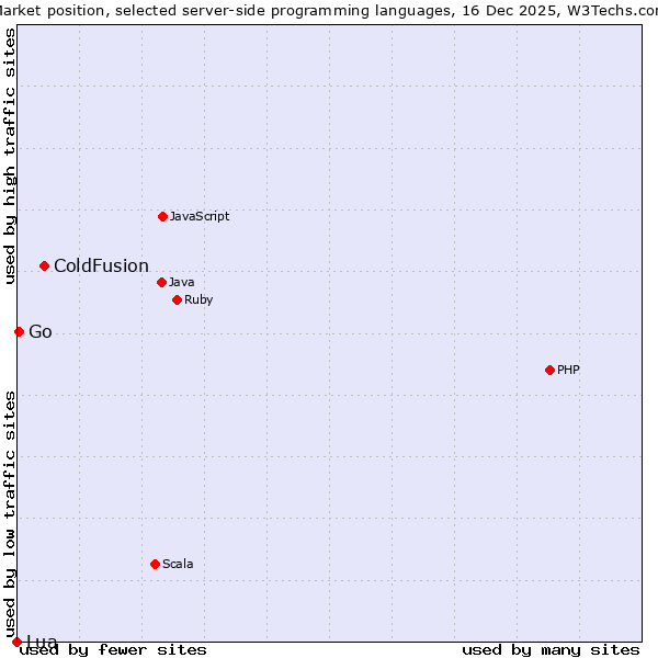 TechnologiesContent ManagementServer-side Languages Client-side Languages JavaScript Libraries CSS Frameworks Web Servers Web Panels Operating Systems Web Hosting Data Centers Reverse Proxies DNS Servers Email Servers SSL Certificate Authorities Content Delivery Traffic Analysis Tools Advertising Networks Tag Managers Social Widgets Site Elements Structured Data Markup Languages Character Encodings Image File Formats Top Level Domains Server Locations Content Languages | Technologies > Server-side Languages > Technology usage comparison Comparison of the usage statistics of ColdFusion vs. Go vs. Lua for websitesThis report shows the usage statistics of ColdFusion vs. Go vs. Lua as server-side programming language on the web. See technologies overview for explanations on the methodologies used in the surveys. Our reports are updated daily. UsageThis diagram shows the percentages of websites using the selected technologies. How to read the diagram: