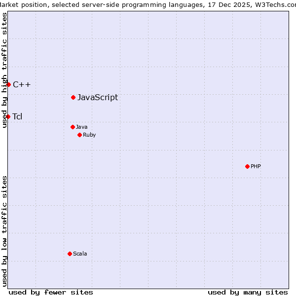 TechnologiesContent ManagementServer-side Languages Client-side Languages JavaScript Libraries CSS Frameworks Web Servers Web Panels Operating Systems Web Hosting Data Centers Reverse Proxies DNS Servers Email Servers SSL Certificate Authorities Content Delivery Traffic Analysis Tools Advertising Networks Tag Managers Social Widgets Site Elements Structured Data Markup Languages Character Encodings Image File Formats Top Level Domains Server Locations Content Languages | Technologies > Server-side Languages > Technology usage comparison Comparison of the usage statistics of JavaScript vs. C++ vs. Tcl for websitesThis report shows the usage statistics of JavaScript vs. C++ vs. Tcl as server-side programming language on the web. See technologies overview for explanations on the methodologies used in the surveys. Our reports are updated daily. UsageThis diagram shows the percentages of websites using the selected technologies. How to read the diagram: