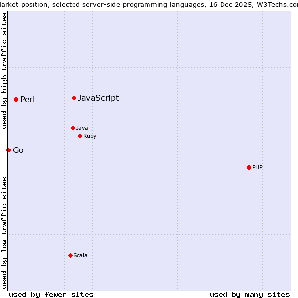 TechnologiesContent ManagementServer-side Languages Client-side Languages JavaScript Libraries CSS Frameworks Web Servers Web Panels Operating Systems Web Hosting Data Centers Reverse Proxies DNS Servers Email Servers SSL Certificate Authorities Content Delivery Traffic Analysis Tools Advertising Networks Tag Managers Social Widgets Site Elements Structured Data Markup Languages Character Encodings Image File Formats Top Level Domains Server Locations Content Languages | Technologies > Server-side Languages > Technology usage comparison Comparison of the usage statistics of JavaScript vs. Perl vs. Go for websitesThis report shows the usage statistics of JavaScript vs. Perl vs. Go as server-side programming language on the web. See technologies overview for explanations on the methodologies used in the surveys. Our reports are updated daily. UsageThis diagram shows the percentages of websites using the selected technologies. How to read the diagram: