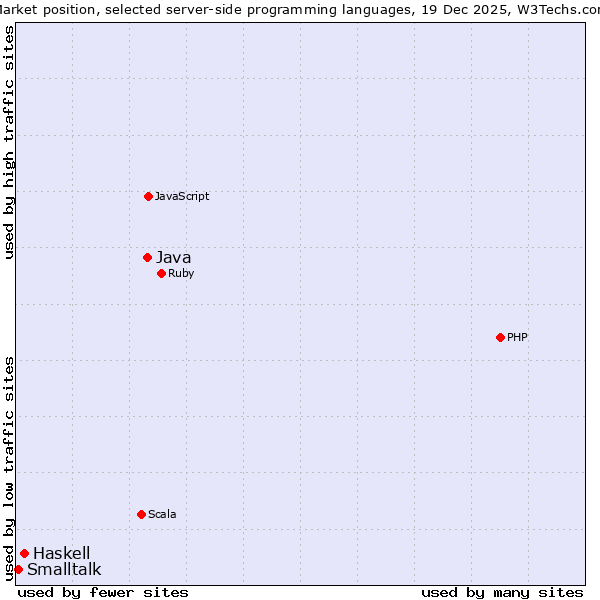 TechnologiesContent ManagementServer-side Languages Client-side Languages JavaScript Libraries CSS Frameworks Web Servers Web Panels Operating Systems Web Hosting Data Centers Reverse Proxies DNS Servers Email Servers SSL Certificate Authorities Content Delivery Traffic Analysis Tools Advertising Networks Tag Managers Social Widgets Site Elements Structured Data Markup Languages Character Encodings Image File Formats Top Level Domains Server Locations Content Languages | Technologies > Server-side Languages > Technology usage comparison Comparison of the usage statistics of Java vs. Haskell vs. Smalltalk for websitesThis report shows the usage statistics of Java vs. Haskell vs. Smalltalk as server-side programming language on the web. See technologies overview for explanations on the methodologies used in the surveys. Our reports are updated daily. UsageThis diagram shows the percentages of websites using the selected technologies. How to read the diagram: