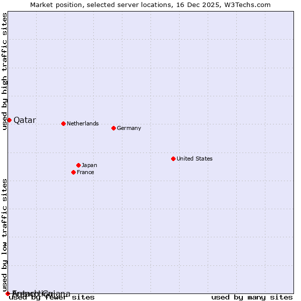 TechnologiesContent ManagementServer-side Languages Client-side Languages JavaScript Libraries CSS Frameworks Web Servers Web Panels Operating Systems Web Hosting Data Centers Reverse Proxies DNS Servers Email Servers SSL Certificate Authorities Content Delivery Traffic Analysis Tools Advertising Networks Tag Managers Social Widgets Site Elements Structured Data Markup Languages Character Encodings Image File Formats Top Level Domains Server Locations Content Languages | Technologies > Server Locations > Technology usage comparison Comparison of the usage statistics of Qatar vs. French Guiana vs. Antarctica for websitesThis report shows the usage statistics of Qatar vs. French Guiana vs. Antarctica as server location on the web. See technologies overview for explanations on the methodologies used in the surveys. Our reports are updated daily. UsageThis diagram shows the percentages of websites using the selected technologies. How to read the diagram: