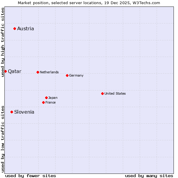 TechnologiesContent ManagementServer-side Languages Client-side Languages JavaScript Libraries CSS Frameworks Web Servers Web Panels Operating Systems Web Hosting Data Centers Reverse Proxies DNS Servers Email Servers SSL Certificate Authorities Content Delivery Traffic Analysis Tools Advertising Networks Tag Managers Social Widgets Site Elements Structured Data Markup Languages Character Encodings Image File Formats Top Level Domains Server Locations Content Languages | Technologies > Server Locations > Technology usage comparison Comparison of the usage statistics of Austria vs. Slovenia vs. Qatar for websitesThis report shows the usage statistics of Austria vs. Slovenia vs. Qatar as server location on the web. See technologies overview for explanations on the methodologies used in the surveys. Our reports are updated daily. UsageThis diagram shows the percentages of websites using the selected technologies. How to read the diagram: