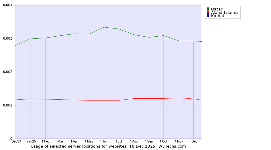 TechnologiesContent ManagementServer-side Languages Client-side Languages JavaScript Libraries CSS Frameworks Web Servers Web Panels Operating Systems Web Hosting Data Centers Reverse Proxies DNS Servers Email Servers SSL Certificate Authorities Content Delivery Traffic Analysis Tools Advertising Networks Tag Managers Social Widgets Site Elements Structured Data Markup Languages Character Encodings Image File Formats Top Level Domains Server Locations Content Languages | Technologies > Server Locations > Technology usage comparison Comparison of the usage statistics of Qatar vs. Aland Islands vs. Kiribati for websitesThis report shows the usage statistics of Qatar vs. Aland Islands vs. Kiribati as server location on the web. See technologies overview for explanations on the methodologies used in the surveys. Our reports are updated daily. UsageThis diagram shows the percentages of websites using the selected technologies. How to read the diagram: