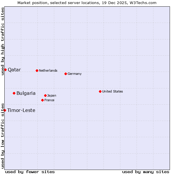 TechnologiesContent ManagementServer-side Languages Client-side Languages JavaScript Libraries CSS Frameworks Web Servers Web Panels Operating Systems Web Hosting Data Centers Reverse Proxies DNS Servers Email Servers SSL Certificate Authorities Content Delivery Traffic Analysis Tools Advertising Networks Tag Managers Social Widgets Site Elements Structured Data Markup Languages Character Encodings Image File Formats Top Level Domains Server Locations Content Languages | Technologies > Server Locations > Technology usage comparison Comparison of the usage statistics of Bulgaria vs. Qatar vs. Timor-Leste for websitesThis report shows the usage statistics of Bulgaria vs. Qatar vs. Timor-Leste as server location on the web. See technologies overview for explanations on the methodologies used in the surveys. Our reports are updated daily. UsageThis diagram shows the percentages of websites using the selected technologies. How to read the diagram:
