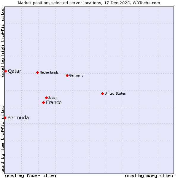 TechnologiesContent ManagementServer-side Languages Client-side Languages JavaScript Libraries CSS Frameworks Web Servers Web Panels Operating Systems Web Hosting Data Centers Reverse Proxies DNS Servers Email Servers SSL Certificate Authorities Content Delivery Traffic Analysis Tools Advertising Networks Tag Managers Social Widgets Site Elements Structured Data Markup Languages Character Encodings Image File Formats Top Level Domains Server Locations Content Languages | Technologies > Server Locations > Technology usage comparison Comparison of the usage statistics of France and territories vs. Qatar vs. Bermuda for websitesThis report shows the usage statistics of France and territories vs. Qatar vs. Bermuda as server location on the web. See technologies overview for explanations on the methodologies used in the surveys. Our reports are updated daily. UsageThis diagram shows the percentages of websites using the selected technologies. How to read the diagram: