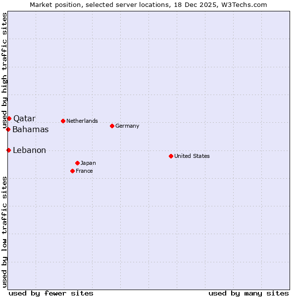 TechnologiesContent ManagementServer-side Languages Client-side Languages JavaScript Libraries CSS Frameworks Web Servers Web Panels Operating Systems Web Hosting Data Centers Reverse Proxies DNS Servers Email Servers SSL Certificate Authorities Content Delivery Traffic Analysis Tools Advertising Networks Tag Managers Social Widgets Site Elements Structured Data Markup Languages Character Encodings Image File Formats Top Level Domains Server Locations Content Languages | Technologies > Server Locations > Technology usage comparison Comparison of the usage statistics of Qatar vs. Lebanon vs. Bahamas for websitesThis report shows the usage statistics of Qatar vs. Lebanon vs. Bahamas as server location on the web. See technologies overview for explanations on the methodologies used in the surveys. Our reports are updated daily. UsageThis diagram shows the percentages of websites using the selected technologies. How to read the diagram: