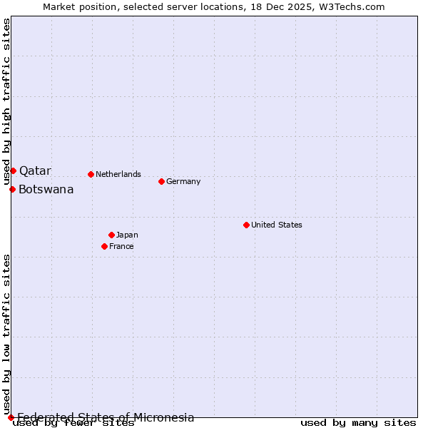 TechnologiesContent ManagementServer-side Languages Client-side Languages JavaScript Libraries CSS Frameworks Web Servers Web Panels Operating Systems Web Hosting Data Centers Reverse Proxies DNS Servers Email Servers SSL Certificate Authorities Content Delivery Traffic Analysis Tools Advertising Networks Tag Managers Social Widgets Site Elements Structured Data Markup Languages Character Encodings Image File Formats Top Level Domains Server Locations Content Languages | Technologies > Server Locations > Technology usage comparison Comparison of the usage statistics of Qatar vs. Botswana vs. Federated States of Micronesia for websitesThis report shows the usage statistics of Qatar vs. Botswana vs. Federated States of Micronesia as server location on the web. See technologies overview for explanations on the methodologies used in the surveys. Our reports are updated daily. UsageThis diagram shows the percentages of websites using the selected technologies. How to read the diagram: