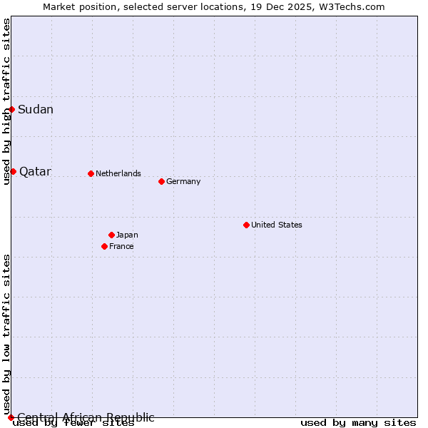 TechnologiesContent ManagementServer-side Languages Client-side Languages JavaScript Libraries CSS Frameworks Web Servers Web Panels Operating Systems Web Hosting Data Centers Reverse Proxies DNS Servers Email Servers SSL Certificate Authorities Content Delivery Traffic Analysis Tools Advertising Networks Tag Managers Social Widgets Site Elements Structured Data Markup Languages Character Encodings Image File Formats Top Level Domains Server Locations Content Languages | Technologies > Server Locations > Technology usage comparison Comparison of the usage statistics of Qatar vs. Sudan vs. Central African Republic for websitesThis report shows the usage statistics of Qatar vs. Sudan vs. Central African Republic as server location on the web. See technologies overview for explanations on the methodologies used in the surveys. Our reports are updated daily. UsageThis diagram shows the percentages of websites using the selected technologies. How to read the diagram: