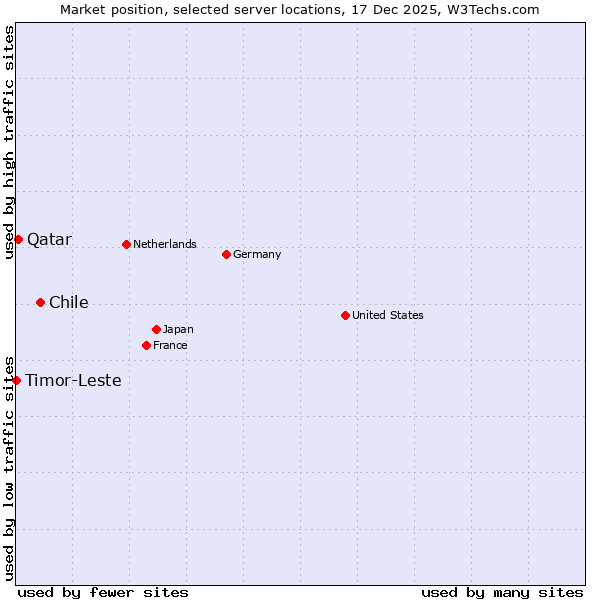 TechnologiesContent ManagementServer-side Languages Client-side Languages JavaScript Libraries CSS Frameworks Web Servers Web Panels Operating Systems Web Hosting Data Centers Reverse Proxies DNS Servers Email Servers SSL Certificate Authorities Content Delivery Traffic Analysis Tools Advertising Networks Tag Managers Social Widgets Site Elements Structured Data Markup Languages Character Encodings Image File Formats Top Level Domains Server Locations Content Languages | Technologies > Server Locations > Technology usage comparison Comparison of the usage statistics of Chile vs. Qatar vs. Timor-Leste for websitesThis report shows the usage statistics of Chile vs. Qatar vs. Timor-Leste as server location on the web. See technologies overview for explanations on the methodologies used in the surveys. Our reports are updated daily. UsageThis diagram shows the percentages of websites using the selected technologies. How to read the diagram: