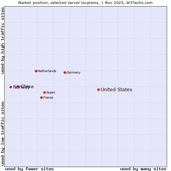 TechnologiesContent ManagementServer-side Languages Client-side Languages JavaScript Libraries CSS Frameworks Web Servers Web Panels Operating Systems Web Hosting Data Centers Reverse Proxies DNS Servers Email Servers SSL Certificate Authorities Content Delivery Traffic Analysis Tools Advertising Networks Tag Managers Social Widgets Site Elements Structured Data Markup Languages Character Encodings Image File Formats Top Level Domains Server Locations Content Languages | Technologies > Server Locations > Technology usage comparison Comparison of the usage statistics of United States and territories vs. China vs. Norway for websitesThis report shows the usage statistics of United States and territories vs. China vs. Norway as server location on the web. See technologies overview for explanations on the methodologies used in the surveys. Our reports are updated daily. UsageThis diagram shows the percentages of websites using the selected technologies. How to read the diagram: