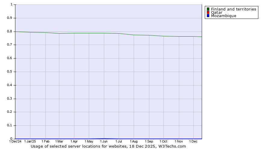 TechnologiesContent ManagementServer-side Languages Client-side Languages JavaScript Libraries CSS Frameworks Web Servers Web Panels Operating Systems Web Hosting Data Centers Reverse Proxies DNS Servers Email Servers SSL Certificate Authorities Content Delivery Traffic Analysis Tools Advertising Networks Tag Managers Social Widgets Site Elements Structured Data Markup Languages Character Encodings Image File Formats Top Level Domains Server Locations Content Languages | Technologies > Server Locations > Technology usage comparison Comparison of the usage statistics of Finland and territories vs. Qatar vs. Mozambique for websitesThis report shows the usage statistics of Finland and territories vs. Qatar vs. Mozambique as server location on the web. See technologies overview for explanations on the methodologies used in the surveys. Our reports are updated daily. UsageThis diagram shows the percentages of websites using the selected technologies. How to read the diagram: