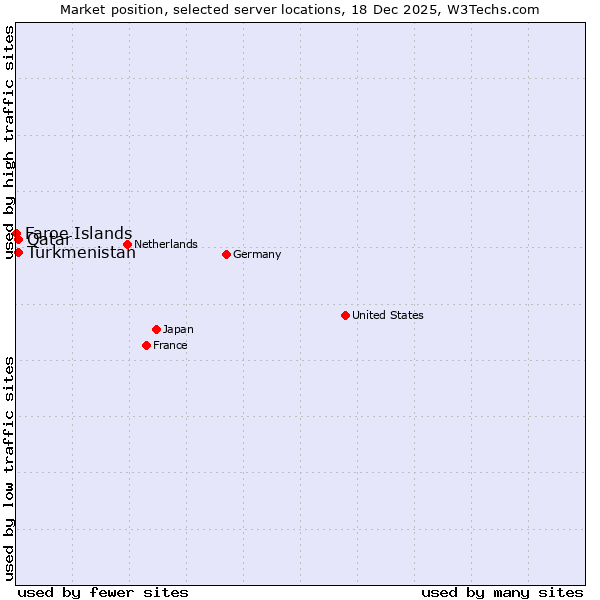 TechnologiesContent ManagementServer-side Languages Client-side Languages JavaScript Libraries CSS Frameworks Web Servers Web Panels Operating Systems Web Hosting Data Centers Reverse Proxies DNS Servers Email Servers SSL Certificate Authorities Content Delivery Traffic Analysis Tools Advertising Networks Tag Managers Social Widgets Site Elements Structured Data Markup Languages Character Encodings Image File Formats Top Level Domains Server Locations Content Languages | Technologies > Server Locations > Technology usage comparison Comparison of the usage statistics of Turkmenistan vs. Qatar vs. Faroe Islands for websitesThis report shows the usage statistics of Turkmenistan vs. Qatar vs. Faroe Islands as server location on the web. See technologies overview for explanations on the methodologies used in the surveys. Our reports are updated daily. UsageThis diagram shows the percentages of websites using the selected technologies. How to read the diagram: