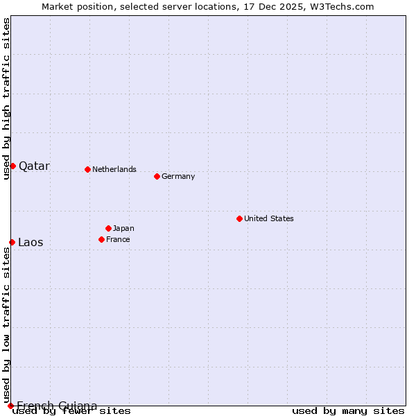 TechnologiesContent ManagementServer-side Languages Client-side Languages JavaScript Libraries CSS Frameworks Web Servers Web Panels Operating Systems Web Hosting Data Centers Reverse Proxies DNS Servers Email Servers SSL Certificate Authorities Content Delivery Traffic Analysis Tools Advertising Networks Tag Managers Social Widgets Site Elements Structured Data Markup Languages Character Encodings Image File Formats Top Level Domains Server Locations Content Languages | Technologies > Server Locations > Technology usage comparison Comparison of the usage statistics of Qatar vs. Laos vs. French Guiana for websitesThis report shows the usage statistics of Qatar vs. Laos vs. French Guiana as server location on the web. See technologies overview for explanations on the methodologies used in the surveys. Our reports are updated daily. UsageThis diagram shows the percentages of websites using the selected technologies. How to read the diagram: