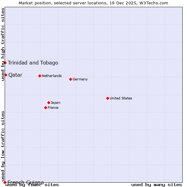TechnologiesContent ManagementServer-side Languages Client-side Languages JavaScript Libraries CSS Frameworks Web Servers Web Panels Operating Systems Web Hosting Data Centers Reverse Proxies DNS Servers Email Servers SSL Certificate Authorities Content Delivery Traffic Analysis Tools Advertising Networks Tag Managers Social Widgets Site Elements Structured Data Markup Languages Character Encodings Image File Formats Top Level Domains Server Locations Content Languages | Technologies > Server Locations > Technology usage comparison Comparison of the usage statistics of Qatar vs. Trinidad and Tobago vs. French Guiana for websitesThis report shows the usage statistics of Qatar vs. Trinidad and Tobago vs. French Guiana as server location on the web. See technologies overview for explanations on the methodologies used in the surveys. Our reports are updated daily. UsageThis diagram shows the percentages of websites using the selected technologies. How to read the diagram:
