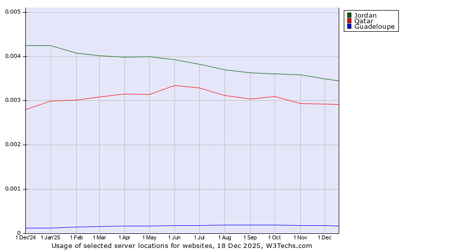 TechnologiesContent ManagementServer-side Languages Client-side Languages JavaScript Libraries CSS Frameworks Web Servers Web Panels Operating Systems Web Hosting Data Centers Reverse Proxies DNS Servers Email Servers SSL Certificate Authorities Content Delivery Traffic Analysis Tools Advertising Networks Tag Managers Social Widgets Site Elements Structured Data Markup Languages Character Encodings Image File Formats Top Level Domains Server Locations Content Languages | Technologies > Server Locations > Technology usage comparison Comparison of the usage statistics of Jordan vs. Qatar vs. Guadeloupe for websitesThis report shows the usage statistics of Jordan vs. Qatar vs. Guadeloupe as server location on the web. See technologies overview for explanations on the methodologies used in the surveys. Our reports are updated daily. UsageThis diagram shows the percentages of websites using the selected technologies. How to read the diagram: