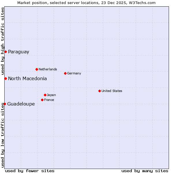 TechnologiesContent ManagementServer-side Languages Client-side Languages JavaScript Libraries CSS Frameworks Web Servers Web Panels Operating Systems Web Hosting Data Centers Reverse Proxies DNS Servers Email Servers SSL Certificate Authorities Content Delivery Traffic Analysis Tools Advertising Networks Tag Managers Social Widgets Site Elements Structured Data Markup Languages Character Encodings Image File Formats Top Level Domains Server Locations Content Languages | Technologies > Server Locations > Technology usage comparison Comparison of the usage statistics of North Macedonia vs. Paraguay vs. Guadeloupe for websitesThis report shows the usage statistics of North Macedonia vs. Paraguay vs. Guadeloupe as server location on the web. See technologies overview for explanations on the methodologies used in the surveys. Our reports are updated daily. UsageThis diagram shows the percentages of websites using the selected technologies. How to read the diagram: