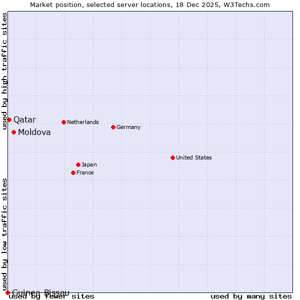 TechnologiesContent ManagementServer-side Languages Client-side Languages JavaScript Libraries CSS Frameworks Web Servers Web Panels Operating Systems Web Hosting Data Centers Reverse Proxies DNS Servers Email Servers SSL Certificate Authorities Content Delivery Traffic Analysis Tools Advertising Networks Tag Managers Social Widgets Site Elements Structured Data Markup Languages Character Encodings Image File Formats Top Level Domains Server Locations Content Languages | Technologies > Server Locations > Technology usage comparison Comparison of the usage statistics of Moldova vs. Qatar vs. Guinea-Bissau for websitesThis report shows the usage statistics of Moldova vs. Qatar vs. Guinea-Bissau as server location on the web. See technologies overview for explanations on the methodologies used in the surveys. Our reports are updated daily. UsageThis diagram shows the percentages of websites using the selected technologies. How to read the diagram: