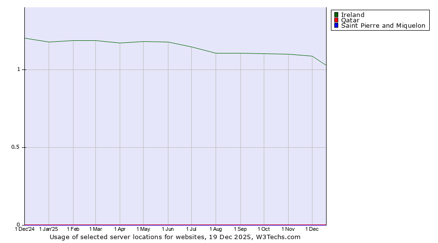 TechnologiesContent ManagementServer-side Languages Client-side Languages JavaScript Libraries CSS Frameworks Web Servers Web Panels Operating Systems Web Hosting Data Centers Reverse Proxies DNS Servers Email Servers SSL Certificate Authorities Content Delivery Traffic Analysis Tools Advertising Networks Tag Managers Social Widgets Site Elements Structured Data Markup Languages Character Encodings Image File Formats Top Level Domains Server Locations Content Languages | Technologies > Server Locations > Technology usage comparison Comparison of the usage statistics of Ireland vs. Qatar vs. Saint Pierre and Miquelon for websitesThis report shows the usage statistics of Ireland vs. Qatar vs. Saint Pierre and Miquelon as server location on the web. See technologies overview for explanations on the methodologies used in the surveys. Our reports are updated daily. UsageThis diagram shows the percentages of websites using the selected technologies. How to read the diagram: