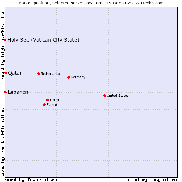 TechnologiesContent ManagementServer-side Languages Client-side Languages JavaScript Libraries CSS Frameworks Web Servers Web Panels Operating Systems Web Hosting Data Centers Reverse Proxies DNS Servers Email Servers SSL Certificate Authorities Content Delivery Traffic Analysis Tools Advertising Networks Tag Managers Social Widgets Site Elements Structured Data Markup Languages Character Encodings Image File Formats Top Level Domains Server Locations Content Languages | Technologies > Server Locations > Technology usage comparison Comparison of the usage statistics of Qatar vs. Lebanon vs. Holy See (Vatican City State) for websitesThis report shows the usage statistics of Qatar vs. Lebanon vs. Holy See (Vatican City State) as server location on the web. See technologies overview for explanations on the methodologies used in the surveys. Our reports are updated daily. UsageThis diagram shows the percentages of websites using the selected technologies. How to read the diagram: