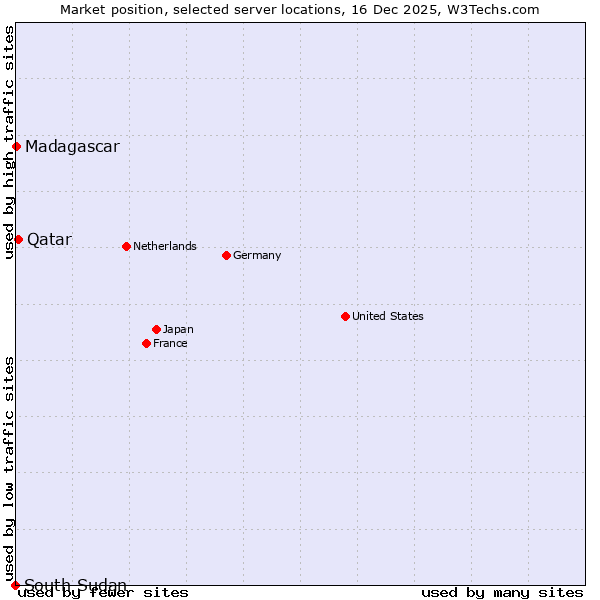 TechnologiesContent ManagementServer-side Languages Client-side Languages JavaScript Libraries CSS Frameworks Web Servers Web Panels Operating Systems Web Hosting Data Centers Reverse Proxies DNS Servers Email Servers SSL Certificate Authorities Content Delivery Traffic Analysis Tools Advertising Networks Tag Managers Social Widgets Site Elements Structured Data Markup Languages Character Encodings Image File Formats Top Level Domains Server Locations Content Languages | Technologies > Server Locations > Technology usage comparison Comparison of the usage statistics of Qatar vs. Madagascar vs. South Sudan for websitesThis report shows the usage statistics of Qatar vs. Madagascar vs. South Sudan as server location on the web. See technologies overview for explanations on the methodologies used in the surveys. Our reports are updated daily. UsageThis diagram shows the percentages of websites using the selected technologies. How to read the diagram: