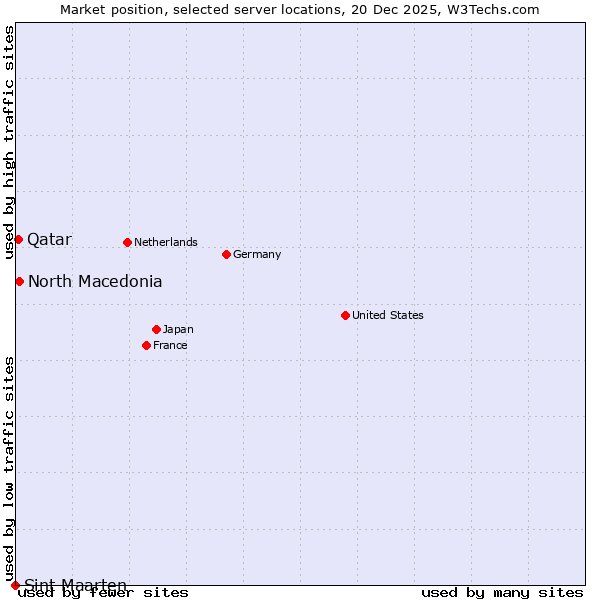 TechnologiesContent ManagementServer-side Languages Client-side Languages JavaScript Libraries CSS Frameworks Web Servers Web Panels Operating Systems Web Hosting Data Centers Reverse Proxies DNS Servers Email Servers SSL Certificate Authorities Content Delivery Traffic Analysis Tools Advertising Networks Tag Managers Social Widgets Site Elements Structured Data Markup Languages Character Encodings Image File Formats Top Level Domains Server Locations Content Languages | Technologies > Server Locations > Technology usage comparison Comparison of the usage statistics of North Macedonia vs. Qatar vs. Sint Maarten for websitesThis report shows the usage statistics of North Macedonia vs. Qatar vs. Sint Maarten as server location on the web. See technologies overview for explanations on the methodologies used in the surveys. Our reports are updated daily. UsageThis diagram shows the percentages of websites using the selected technologies. How to read the diagram: