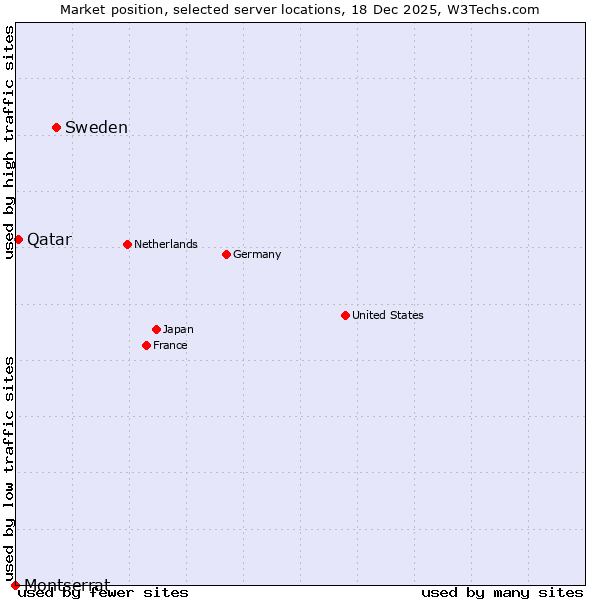 TechnologiesContent ManagementServer-side Languages Client-side Languages JavaScript Libraries CSS Frameworks Web Servers Web Panels Operating Systems Web Hosting Data Centers Reverse Proxies DNS Servers Email Servers SSL Certificate Authorities Content Delivery Traffic Analysis Tools Advertising Networks Tag Managers Social Widgets Site Elements Structured Data Markup Languages Character Encodings Image File Formats Top Level Domains Server Locations Content Languages | Technologies > Server Locations > Technology usage comparison Comparison of the usage statistics of Sweden vs. Qatar vs. Montserrat for websitesThis report shows the usage statistics of Sweden vs. Qatar vs. Montserrat as server location on the web. See technologies overview for explanations on the methodologies used in the surveys. Our reports are updated daily. UsageThis diagram shows the percentages of websites using the selected technologies. How to read the diagram: