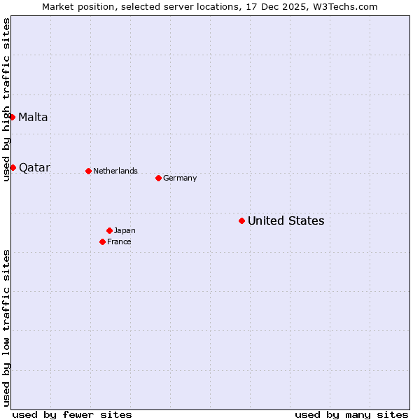TechnologiesContent ManagementServer-side Languages Client-side Languages JavaScript Libraries CSS Frameworks Web Servers Web Panels Operating Systems Web Hosting Data Centers Reverse Proxies DNS Servers Email Servers SSL Certificate Authorities Content Delivery Traffic Analysis Tools Advertising Networks Tag Managers Social Widgets Site Elements Structured Data Markup Languages Character Encodings Image File Formats Top Level Domains Server Locations Content Languages | Technologies > Server Locations > Technology usage comparison Comparison of the usage statistics of United States vs. Qatar vs. Malta for websitesThis report shows the usage statistics of United States vs. Qatar vs. Malta as server location on the web. See technologies overview for explanations on the methodologies used in the surveys. Our reports are updated daily. UsageThis diagram shows the percentages of websites using the selected technologies. How to read the diagram: