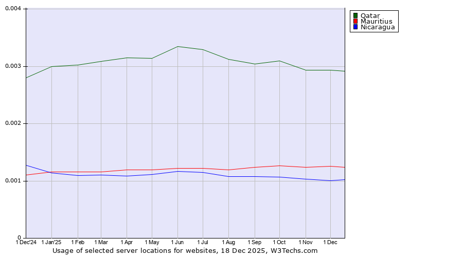 TechnologiesContent ManagementServer-side Languages Client-side Languages JavaScript Libraries CSS Frameworks Web Servers Web Panels Operating Systems Web Hosting Data Centers Reverse Proxies DNS Servers Email Servers SSL Certificate Authorities Content Delivery Traffic Analysis Tools Advertising Networks Tag Managers Social Widgets Site Elements Structured Data Markup Languages Character Encodings Image File Formats Top Level Domains Server Locations Content Languages | Technologies > Server Locations > Technology usage comparison Comparison of the usage statistics of Qatar vs. Mauritius vs. Nicaragua for websitesThis report shows the usage statistics of Qatar vs. Mauritius vs. Nicaragua as server location on the web. See technologies overview for explanations on the methodologies used in the surveys. Our reports are updated daily. UsageThis diagram shows the percentages of websites using the selected technologies. How to read the diagram: