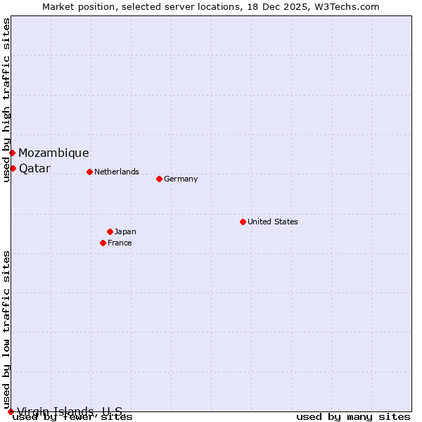 TechnologiesContent ManagementServer-side Languages Client-side Languages JavaScript Libraries CSS Frameworks Web Servers Web Panels Operating Systems Web Hosting Data Centers Reverse Proxies DNS Servers Email Servers SSL Certificate Authorities Content Delivery Traffic Analysis Tools Advertising Networks Tag Managers Social Widgets Site Elements Structured Data Markup Languages Character Encodings Image File Formats Top Level Domains Server Locations Content Languages | Technologies > Server Locations > Technology usage comparison Comparison of the usage statistics of Qatar vs. Mozambique vs. Virgin Islands, U.S. for websitesThis report shows the usage statistics of Qatar vs. Mozambique vs. Virgin Islands, U.S. as server location on the web. See technologies overview for explanations on the methodologies used in the surveys. Our reports are updated daily. UsageThis diagram shows the percentages of websites using the selected technologies. How to read the diagram: