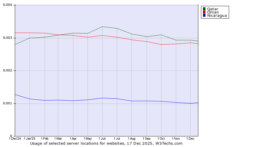 TechnologiesContent ManagementServer-side Languages Client-side Languages JavaScript Libraries CSS Frameworks Web Servers Web Panels Operating Systems Web Hosting Data Centers Reverse Proxies DNS Servers Email Servers SSL Certificate Authorities Content Delivery Traffic Analysis Tools Advertising Networks Tag Managers Social Widgets Site Elements Structured Data Markup Languages Character Encodings Image File Formats Top Level Domains Server Locations Content Languages | Technologies > Server Locations > Technology usage comparison Comparison of the usage statistics of Qatar vs. Oman vs. Nicaragua for websitesThis report shows the usage statistics of Qatar vs. Oman vs. Nicaragua as server location on the web. See technologies overview for explanations on the methodologies used in the surveys. Our reports are updated daily. UsageThis diagram shows the percentages of websites using the selected technologies. How to read the diagram: