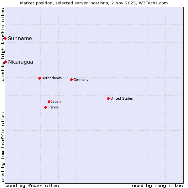 TechnologiesContent ManagementServer-side Languages Client-side Languages JavaScript Libraries CSS Frameworks Web Servers Web Panels Operating Systems Web Hosting Data Centers Reverse Proxies DNS Servers Email Servers SSL Certificate Authorities Content Delivery Traffic Analysis Tools Advertising Networks Tag Managers Social Widgets Site Elements Structured Data Markup Languages Character Encodings Image File Formats Top Level Domains Server Locations Content Languages ComparisonCompare with other | Technologies > Server Locations > Technology usage comparison Comparison of the usage statistics of Nicaragua vs. Suriname for websitesThis report shows the usage statistics of Nicaragua vs. Suriname as server location on the web. See technologies overview for explanations on the methodologies used in the surveys. Our reports are updated daily. UsageThis diagram shows the percentages of websites using the selected technologies. How to read the diagram: