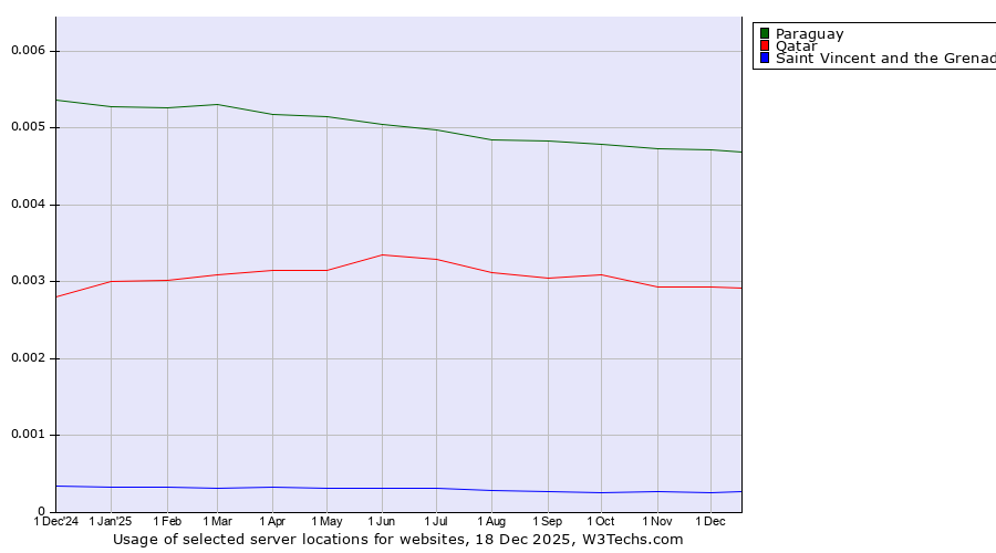 TechnologiesContent ManagementServer-side Languages Client-side Languages JavaScript Libraries CSS Frameworks Web Servers Web Panels Operating Systems Web Hosting Data Centers Reverse Proxies DNS Servers Email Servers SSL Certificate Authorities Content Delivery Traffic Analysis Tools Advertising Networks Tag Managers Social Widgets Site Elements Structured Data Markup Languages Character Encodings Image File Formats Top Level Domains Server Locations Content Languages | Technologies > Server Locations > Technology usage comparison Comparison of the usage statistics of Paraguay vs. Qatar vs. Saint Vincent and the Grenadines for websitesThis report shows the usage statistics of Paraguay vs. Qatar vs. Saint Vincent and the Grenadines as server location on the web. See technologies overview for explanations on the methodologies used in the surveys. Our reports are updated daily. UsageThis diagram shows the percentages of websites using the selected technologies. How to read the diagram: