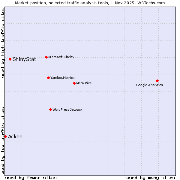 TechnologiesContent ManagementServer-side Languages Client-side Languages JavaScript Libraries CSS Frameworks Web Servers Web Panels Operating Systems Web Hosting Data Centers Reverse Proxies DNS Servers Email Servers SSL Certificate Authorities Content Delivery Traffic Analysis Tools Advertising Networks Tag Managers Social Widgets Site Elements Structured Data Markup Languages Character Encodings Image File Formats Top Level Domains Server Locations Content Languages ComparisonCompare with other | Technologies > Traffic Analysis Tools > Technology usage comparison Comparison of the usage statistics of ShinyStat vs. Ackee for websitesThis report shows the usage statistics of ShinyStat vs. Ackee as traffic analysis tool on the web. See technologies overview for explanations on the methodologies used in the surveys. Our reports are updated daily. Usage and market shareThis diagram shows the percentages of websites using the selected technologies. How to read the diagram:
