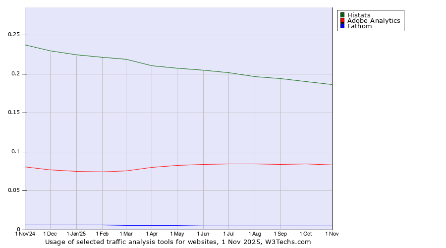 TechnologiesContent ManagementServer-side Languages Client-side Languages JavaScript Libraries CSS Frameworks Web Servers Web Panels Operating Systems Web Hosting Data Centers Reverse Proxies DNS Servers Email Servers SSL Certificate Authorities Content Delivery Traffic Analysis Tools Advertising Networks Tag Managers Social Widgets Site Elements Structured Data Markup Languages Character Encodings Image File Formats Top Level Domains Server Locations Content Languages | Technologies > Traffic Analysis Tools > Technology usage comparison Comparison of the usage statistics of Histats vs. Adobe Analytics vs. Fathom for websitesThis report shows the usage statistics of Histats vs. Adobe Analytics vs. Fathom as traffic analysis tool on the web. See technologies overview for explanations on the methodologies used in the surveys. Our reports are updated daily. Usage and market shareThis diagram shows the percentages of websites using the selected technologies. How to read the diagram: