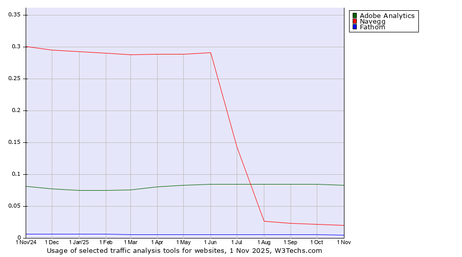 TechnologiesContent ManagementServer-side Languages Client-side Languages JavaScript Libraries CSS Frameworks Web Servers Web Panels Operating Systems Web Hosting Data Centers Reverse Proxies DNS Servers Email Servers SSL Certificate Authorities Content Delivery Traffic Analysis Tools Advertising Networks Tag Managers Social Widgets Site Elements Structured Data Markup Languages Character Encodings Image File Formats Top Level Domains Server Locations Content Languages | Technologies > Traffic Analysis Tools > Technology usage comparison Comparison of the usage statistics of Adobe Analytics vs. Navegg vs. Fathom for websitesThis report shows the usage statistics of Adobe Analytics vs. Navegg vs. Fathom as traffic analysis tool on the web. See technologies overview for explanations on the methodologies used in the surveys. Our reports are updated daily. Usage and market shareThis diagram shows the percentages of websites using the selected technologies. How to read the diagram: