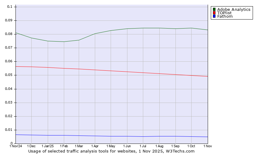 TechnologiesContent ManagementServer-side Languages Client-side Languages JavaScript Libraries CSS Frameworks Web Servers Web Panels Operating Systems Web Hosting Data Centers Reverse Proxies DNS Servers Email Servers SSL Certificate Authorities Content Delivery Traffic Analysis Tools Advertising Networks Tag Managers Social Widgets Site Elements Structured Data Markup Languages Character Encodings Image File Formats Top Level Domains Server Locations Content Languages | Technologies > Traffic Analysis Tools > Technology usage comparison Comparison of the usage statistics of Adobe Analytics vs. TOPlist vs. Fathom for websitesThis report shows the usage statistics of Adobe Analytics vs. TOPlist vs. Fathom as traffic analysis tool on the web. See technologies overview for explanations on the methodologies used in the surveys. Our reports are updated daily. Usage and market shareThis diagram shows the percentages of websites using the selected technologies. How to read the diagram: