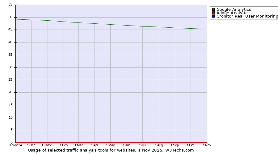 TechnologiesContent ManagementServer-side Languages Client-side Languages JavaScript Libraries CSS Frameworks Web Servers Web Panels Operating Systems Web Hosting Data Centers Reverse Proxies DNS Servers Email Servers SSL Certificate Authorities Content Delivery Traffic Analysis Tools Advertising Networks Tag Managers Social Widgets Site Elements Structured Data Markup Languages Character Encodings Image File Formats Top Level Domains Server Locations Content Languages | Technologies > Traffic Analysis Tools > Technology usage comparison Comparison of the usage statistics of Google Analytics vs. Adobe Analytics vs. Cronitor Real User Monitoring for websitesThis report shows the usage statistics of Google Analytics vs. Adobe Analytics vs. Cronitor Real User Monitoring as traffic analysis tool on the web. See technologies overview for explanations on the methodologies used in the surveys. Our reports are updated daily. Usage and market shareThis diagram shows the percentages of websites using the selected technologies. How to read the diagram: