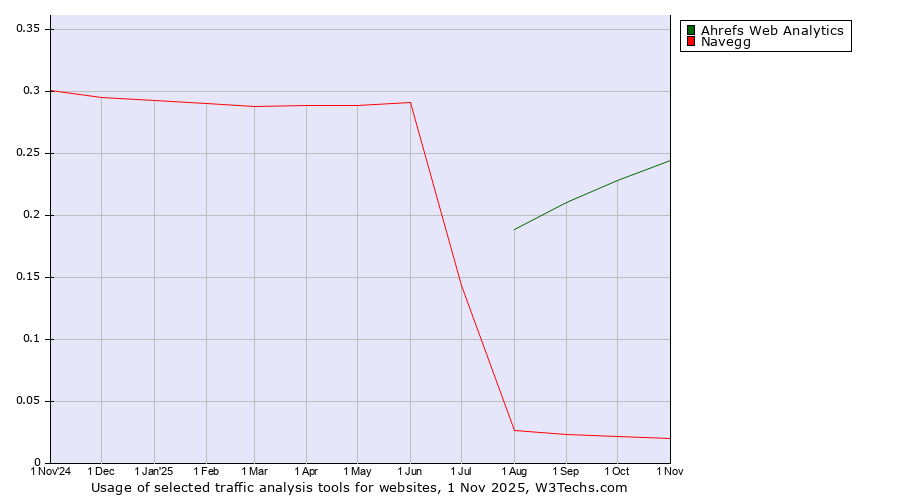 TechnologiesContent ManagementServer-side Languages Client-side Languages JavaScript Libraries CSS Frameworks Web Servers Web Panels Operating Systems Web Hosting Data Centers Reverse Proxies DNS Servers Email Servers SSL Certificate Authorities Content Delivery Traffic Analysis Tools Advertising Networks Tag Managers Social Widgets Site Elements Structured Data Markup Languages Character Encodings Image File Formats Top Level Domains Server Locations Content Languages ComparisonCompare with other | Technologies > Traffic Analysis Tools > Technology usage comparison Comparison of the usage statistics of Ahrefs Web Analytics vs. Navegg for websitesThis report shows the usage statistics of Ahrefs Web Analytics vs. Navegg as traffic analysis tool on the web. See technologies overview for explanations on the methodologies used in the surveys. Our reports are updated daily. Usage and market shareThis diagram shows the percentages of websites using the selected technologies. How to read the diagram: