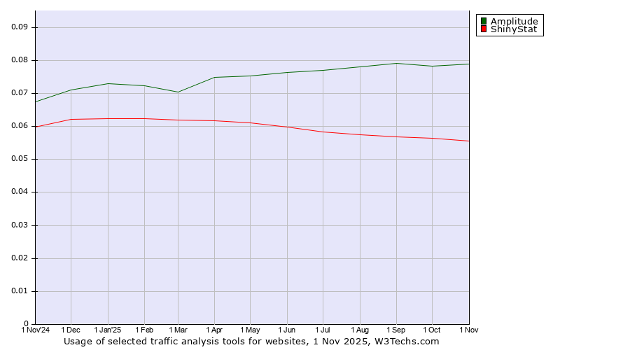 TechnologiesContent ManagementServer-side Languages Client-side Languages JavaScript Libraries CSS Frameworks Web Servers Web Panels Operating Systems Web Hosting Data Centers Reverse Proxies DNS Servers Email Servers SSL Certificate Authorities Content Delivery Traffic Analysis Tools Advertising Networks Tag Managers Social Widgets Site Elements Structured Data Markup Languages Character Encodings Image File Formats Top Level Domains Server Locations Content Languages ComparisonCompare with other | Technologies > Traffic Analysis Tools > Technology usage comparison Comparison of the usage statistics of Amplitude vs. ShinyStat for websitesThis report shows the usage statistics of Amplitude vs. ShinyStat as traffic analysis tool on the web. See technologies overview for explanations on the methodologies used in the surveys. Our reports are updated daily. Usage and market shareThis diagram shows the percentages of websites using the selected technologies. How to read the diagram: