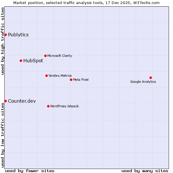 TechnologiesContent ManagementServer-side Languages Client-side Languages JavaScript Libraries CSS Frameworks Web Servers Web Panels Operating Systems Web Hosting Data Centers Reverse Proxies DNS Servers Email Servers SSL Certificate Authorities Content Delivery Traffic Analysis Tools Advertising Networks Tag Managers Social Widgets Site Elements Structured Data Markup Languages Character Encodings Image File Formats Top Level Domains Server Locations Content Languages | Technologies > Traffic Analysis Tools > Technology usage comparison Comparison of the usage statistics of HubSpot vs. Counter.dev vs. Publytics for websitesThis report shows the usage statistics of HubSpot vs. Counter.dev vs. Publytics as traffic analysis tool on the web. See technologies overview for explanations on the methodologies used in the surveys. Our reports are updated daily. Usage and market shareThis diagram shows the percentages of websites using the selected technologies. How to read the diagram: